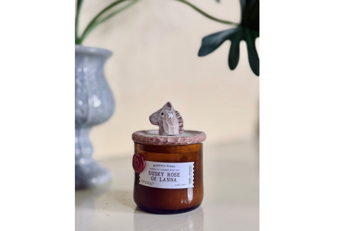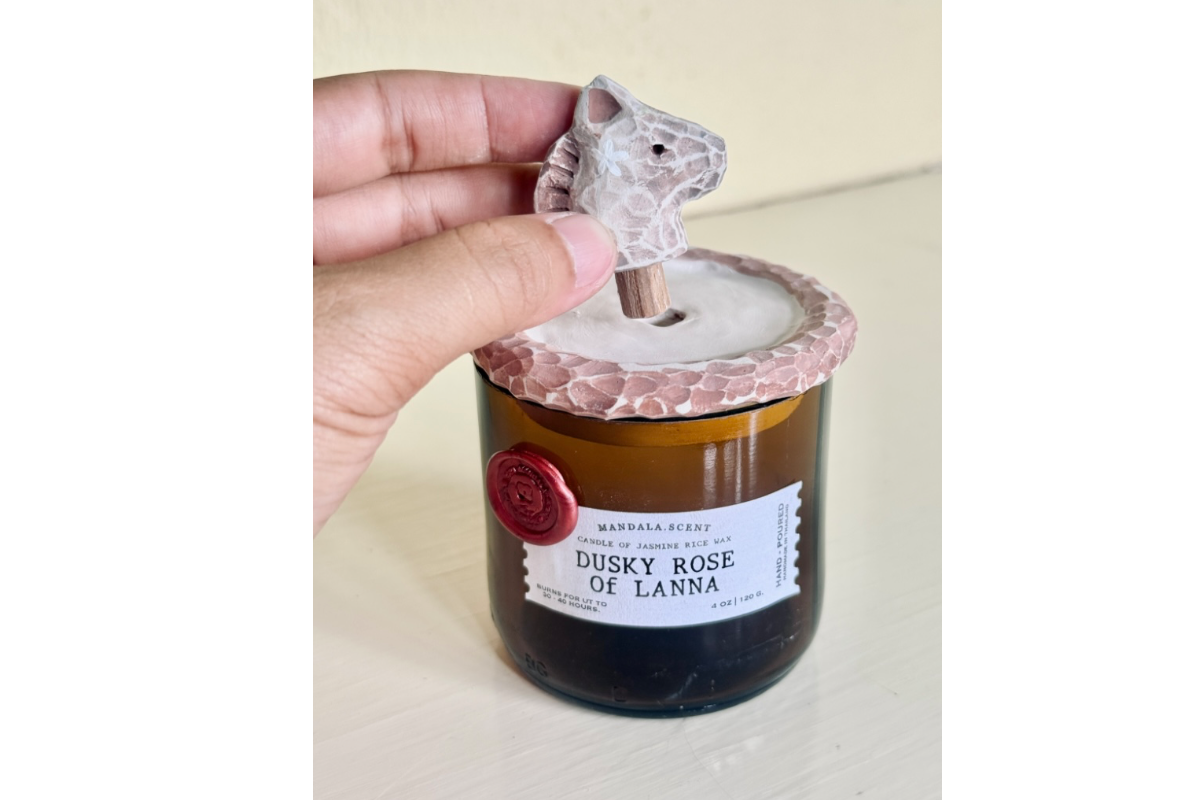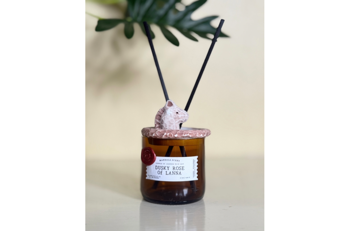 • เทียนหอมของเราทำจากไขข้าวหอมมะลิไทย มอบกลิ่นหอมละมุนที่เป็นเอกลักษณ์แบบไทยล้านนา บรรจุในภาชนะรักษ์โลกที่ทำจากขวดแก้วเหลือใช้ โดยผ่านการตัดและขัดด้วยมือทีละใบ ส่วนฝาปิดทำจากดินเซรามิกของจังหวัดลำปาง ซึ่งผลิตโดยช่างฝีมือในชุมชนท้องถิ่น