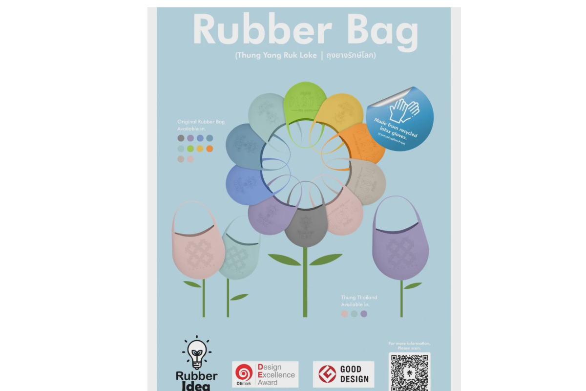 Rubber bag is reusable and made from recycled latex gloves (not contaminated). It feels soft but tough and can be cleaned easily. The design was inspired by a latex droplet from a natural rubber tree and a Thai traditional sack bag. We used Pastel colors and engraved the Thai word "Thung Yang", which means Rubber Bag, but also has the same meaning as condom, to attract attention and create a humorous environment.