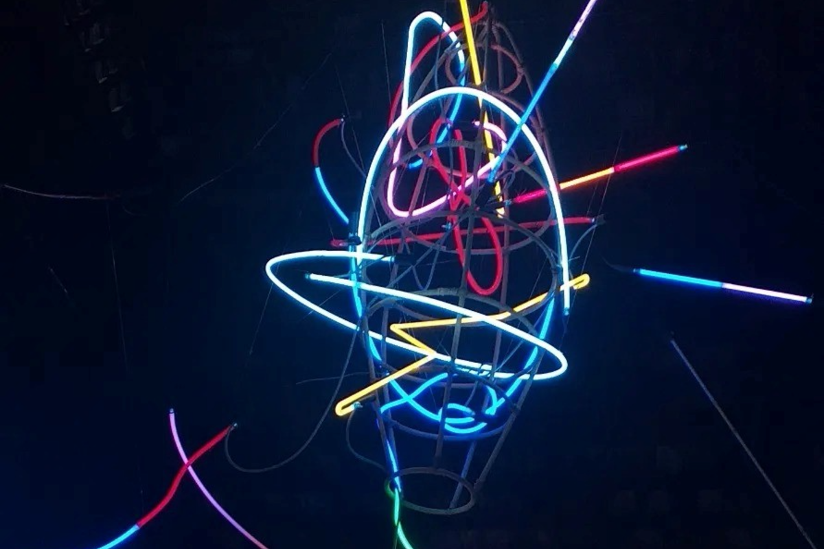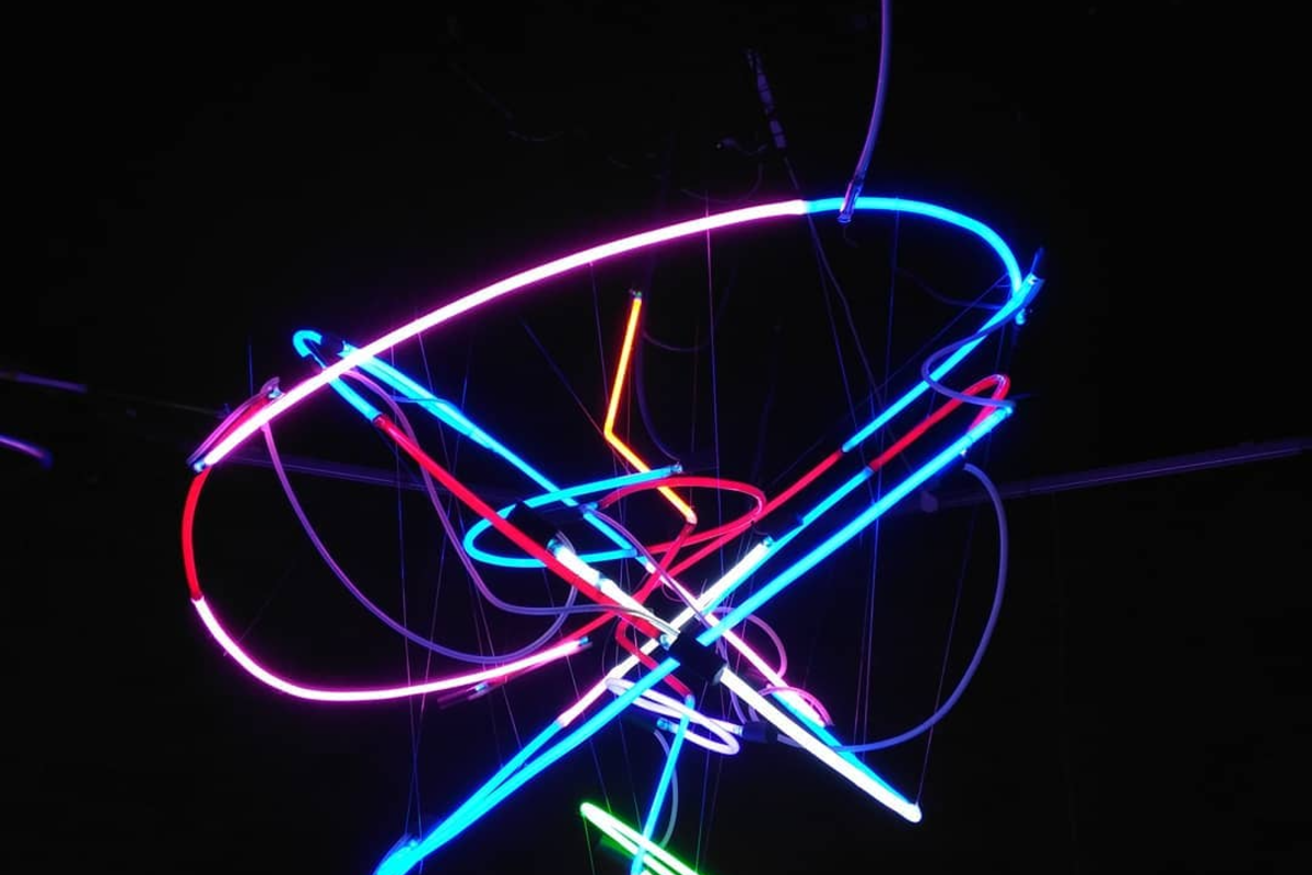 Fractured Galaxy, a loose abstract cartoon-like galaxy, is rendered as a graphic proposition of matter at its most vast and deep—reduced to a version of electrically charged tubes of material—fractured and orbiting coloured neon. In one sense, it is a Mickey Mouse galaxy, but as we know, even within these reductions there is sense that can be made, and nonsense is more plausible in today’s greater cultural environment than from the intense fracturing of a complex world. The simplicity of things is also our much-needed respite from the digital into the material and back.